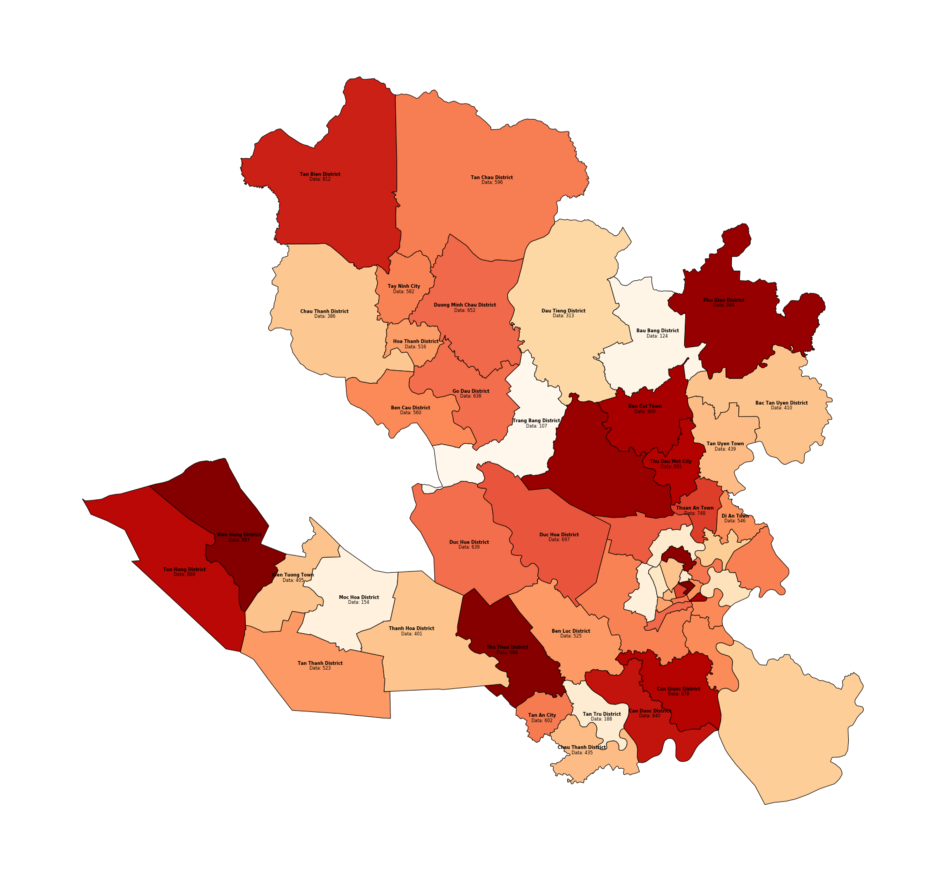 plotdata = geodata[geodata['Province'].isin(['Binh Duong Province','Tay Ninh Province','Long An Province','Ho Chi Minh City'])]PALETTE = 'OrRd'EXCLUDE_PROVINCE = ['Ho Chi Minh City']gplt.choropleth(plotdata, hue = plotdata['Data'], cmap = PALETTE, figsize = (60,30))for _, row in plotdata.iterrows():if row['Province'] not in EXCLUDE_PROVINCE:hue = round(row['Data'],2)plt.text(s=row['Name'], x = row['coords'][0], y = row['coords'][1],horizontalalignment='center', fontdict = {'weight': 'bold', 'size': 8})plt.text(s='Data: ' + f'{hue:,}', x=row['coords'][0],y = row['coords'][1] - 0.01 ,horizontalalignment='center', fontdict = {'size': 8})