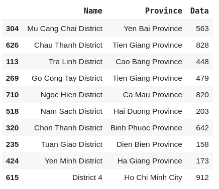 We will also need some data to plot on the map. I have prepared some sample data in the form of a .csv file. It contains the numerical data of some districts in Vietnam and the province they belong to. We can read the file with pandas.