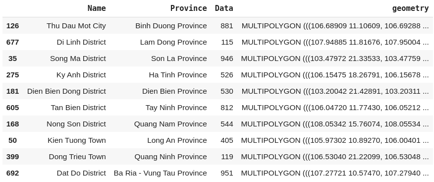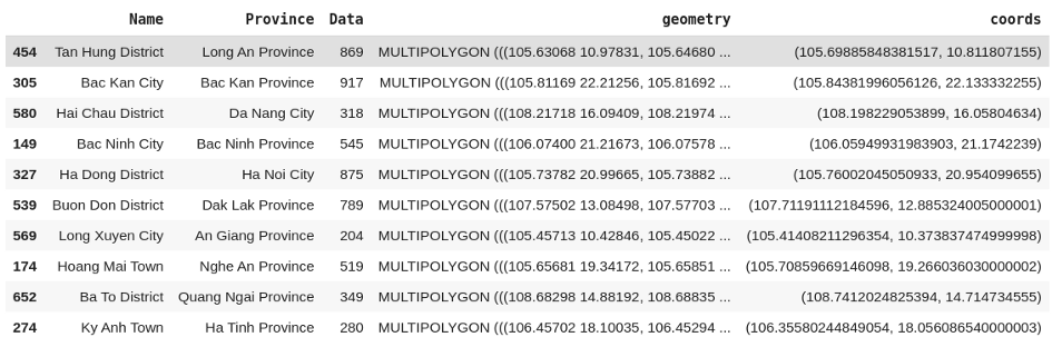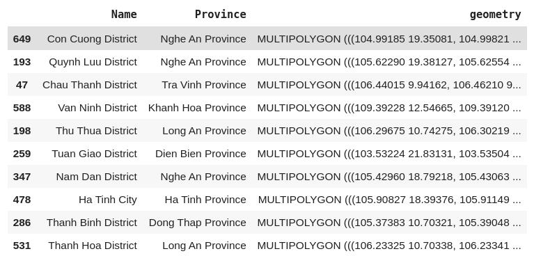 GEO_URL = 'http://opendata.hcmgis.vn/geoserver/wfs?srsName=EPSG%3A4326&typename=geonode%3Avietnam_districts&outputFormat=json&version=1.0.0&service=WFS&request=GetFeature'geo = gpd.read_file(GEO_URL)# We only need to care about the Name, Province and geometry columngeo = geo[['Name', 'Province', 'geometry']]geo.sample(10)