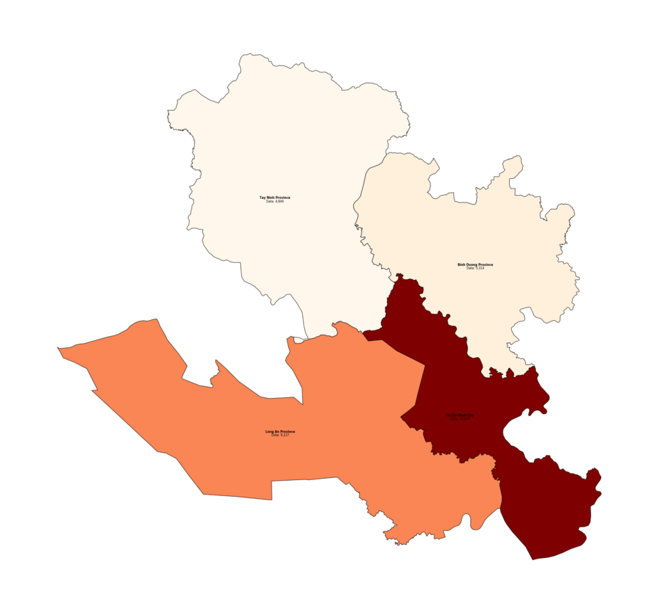 Notice those messy text cluster on the lower right corner? It is because the districts in Ho Chi Minh City are too small and their labels are too closed to each other. One solution is to exclude the labels of Ho Chi Minh City’s districts from the map.