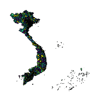 It is probably not a good idea to plot all districts in Vietnam together as there are so many of them. Instead, we can break down the country by region. For example, I can select only four provinces to plot by applying a filter to the DataFrame.