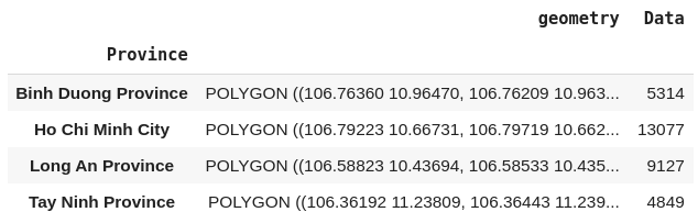 Geometric data of countries around the world are widely available on the Internet. They come in many different formats, most of which are supported by geopandas. Geometric data of provinces in Vietnam is available on HCMGIS OpenData. In this example, I will use the JSON format. Geopandas has the function read_file to read geometric data from a source. This returns a Geopandas DataFrame containing many columns, but we will only need to care about the Name (District), Province and geometry column.